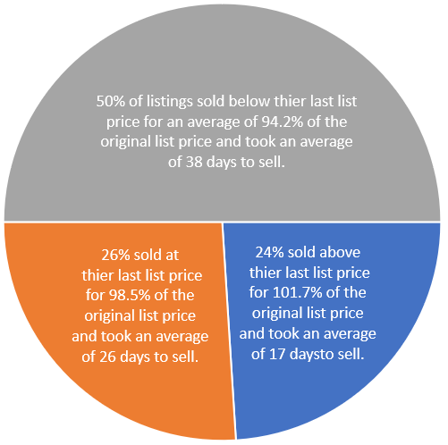 The data for sold homes in December is pretty decent. While 50% sold below their last list price the average market time overall was really good. The average price per sq/ft for the 68 homes that have closed so far in December is $571 with average days on market of 30 and an overall sales price to original list price of 97.1%. Below is a pie chart showing the break down for these 68 homes. 50% sold below their last list price for an average of 94.2% of their original list price and had 38 days of market time. 26% sold at their last list price, but at 98.5% of their original list price with 26 days of market time. The last group, 24% sold above their last list price for an average of 101.7% of their original list price and had market time of 17 days.