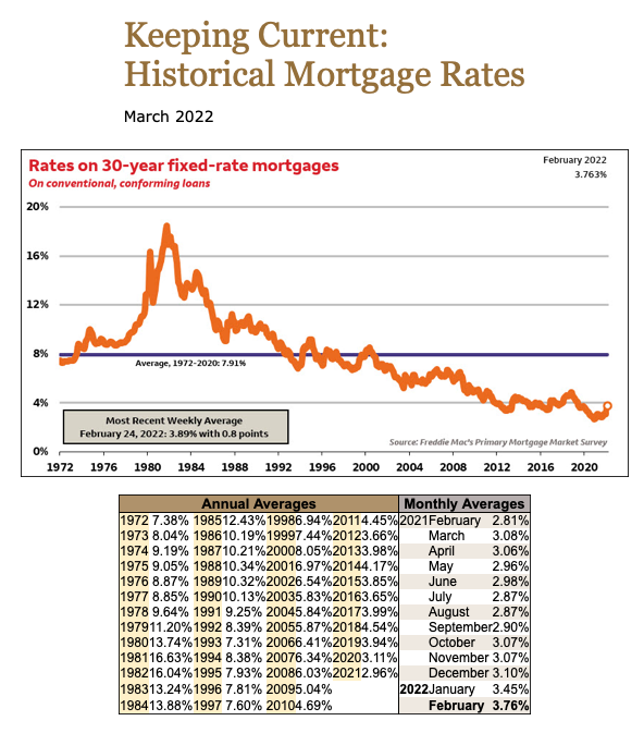 Interest rates are also creeping up. Conforming rates are now at 4.25% and Jumbo at 3.5%. Conforming rates are up a ½ point since the end of January and Jumbo up a ¼. Historically though, we are still doing well. Check out the rate history for the past 50 years. Of course it is all relative. Back in the early 80s when rates were over 16%, the median home price in King County was under 75K.