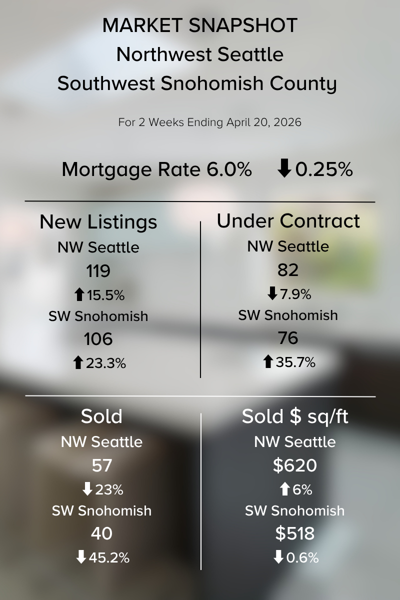 New listings and inventory are up in both NW Seattle and SW Snohomish County, which is typically for this time of year. As I’ve mentioned before, April, May and June tend to be our highest months of new listings hitting the market.