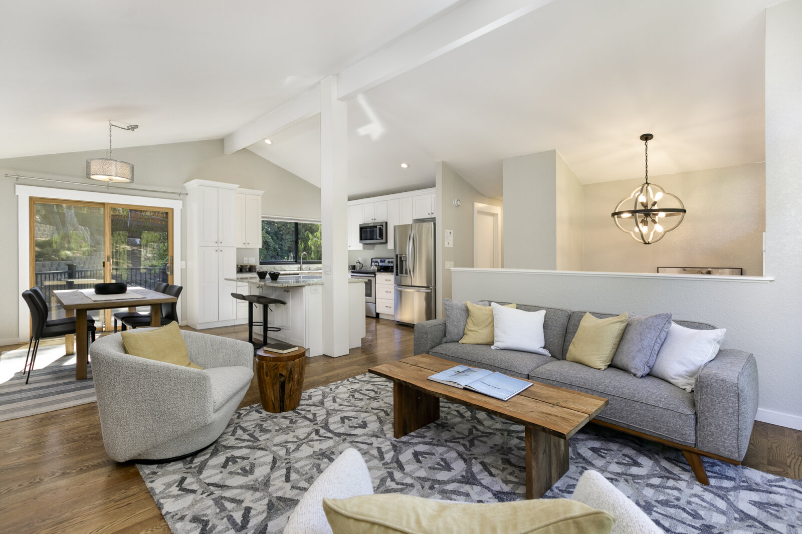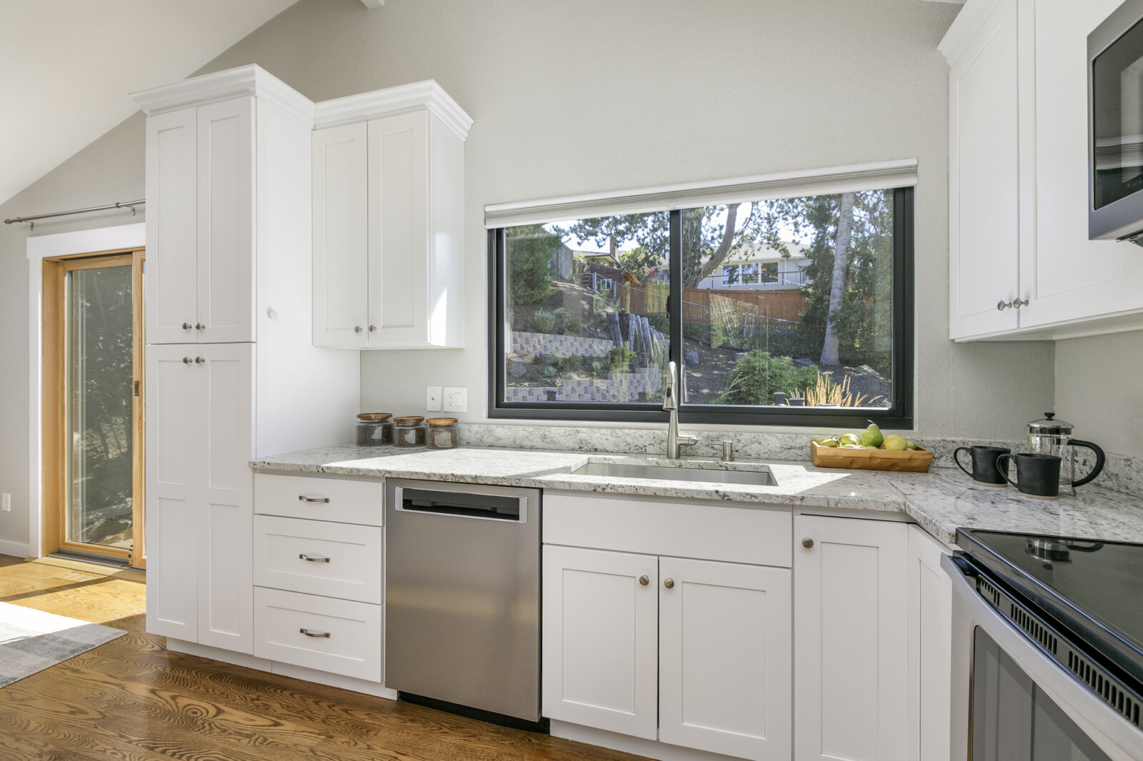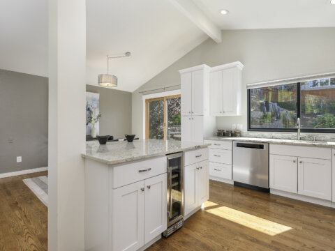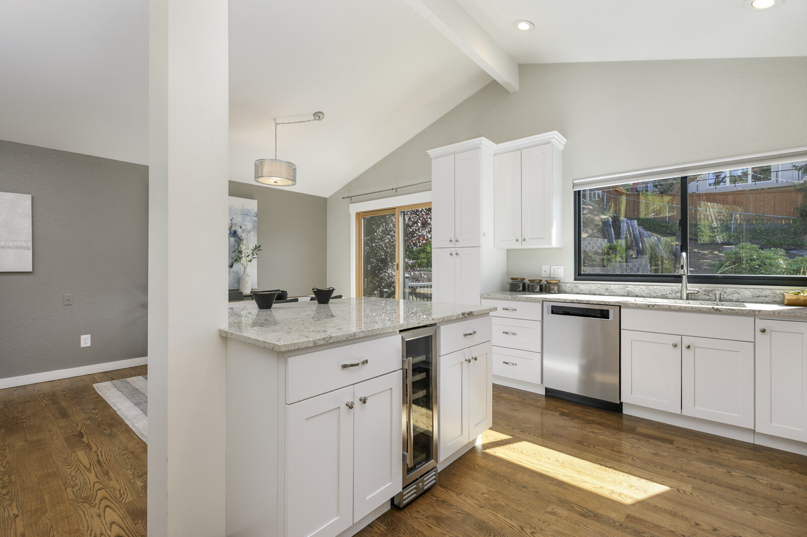 Step inside and be immediately impressed by the bright, open layout. The heart of the home is a gorgeous, remodeled kitchen, where sleek slab granite countertops, an expansive island with bar seating, stainless steel appliances, and a built-in wine fridge make both everyday cooking and entertaining a breeze. Sliding doors open to a deck and landscaped backyard, creating a seamless connection to outdoor living.