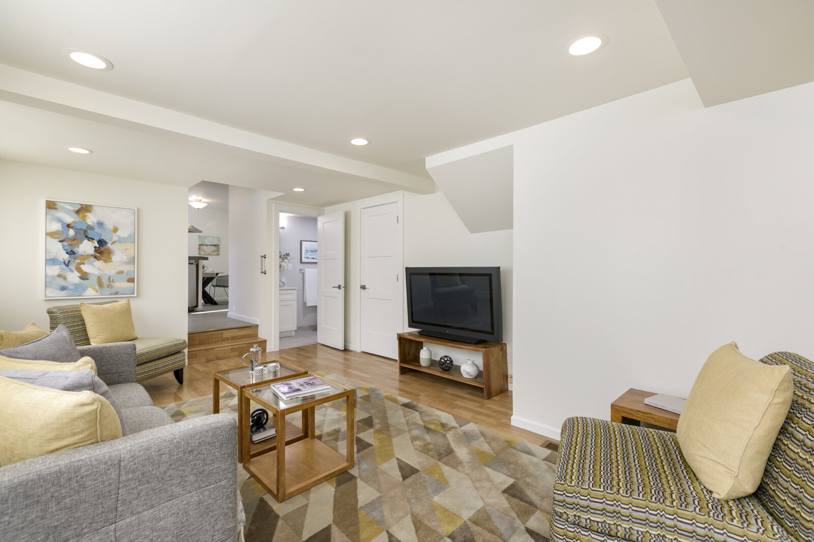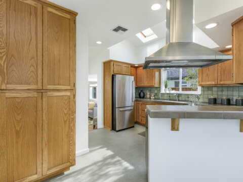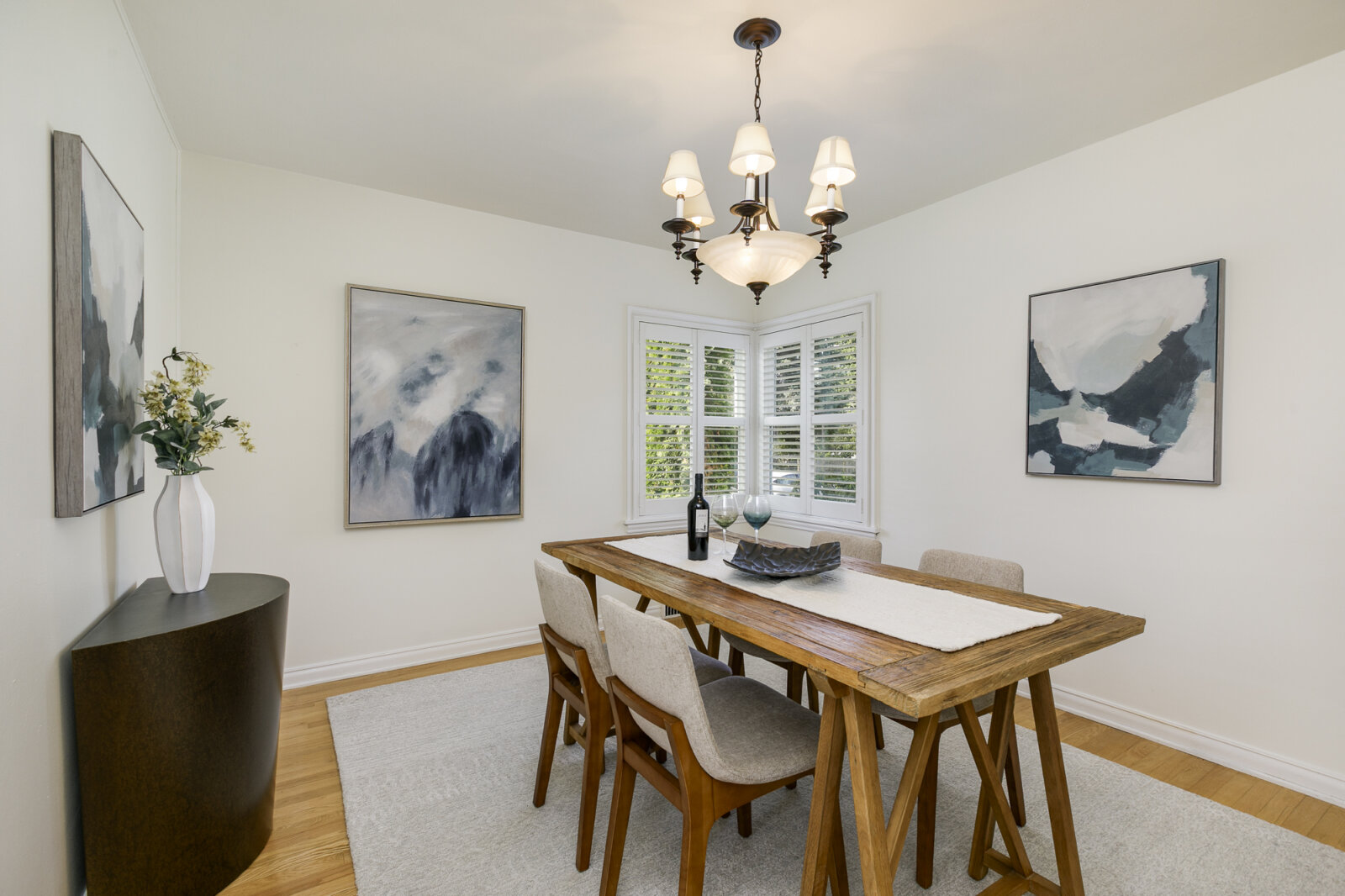 The spacious dining room also features plantation shutters, creating an inviting setting for gatherings. The kitchen is designed for both form and function, featuring a Viking range, skylights, a breakfast bar above the stove for easy conversation while cooking, and an efficient layout that supports excellent workflow. Two main-floor bedrooms overlook the private backyard, while the cozy main-level bath evokes a charming 1930s feel and has been fully re-tiled and re-plumbed. Just off the kitchen, the family room is ideal for entertaining guests or enjoying movie nights, complete with a nearby three-quarter bath and seamless access to the deck for indoor-outdoor living.