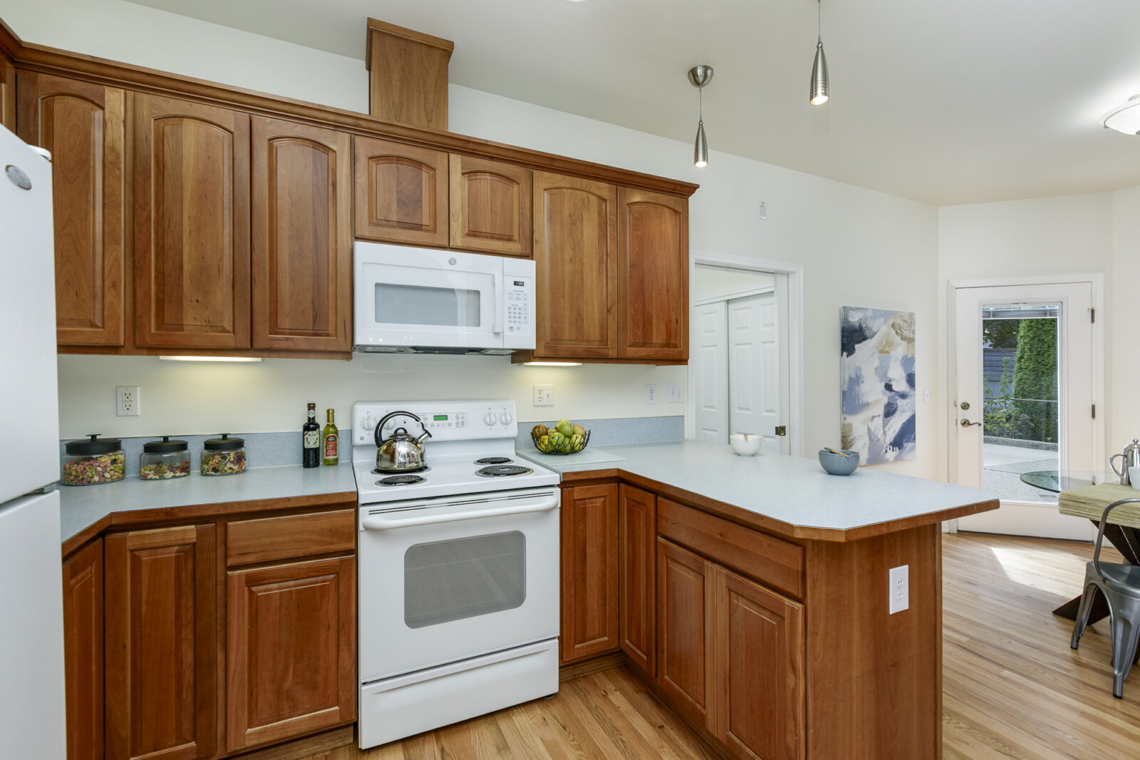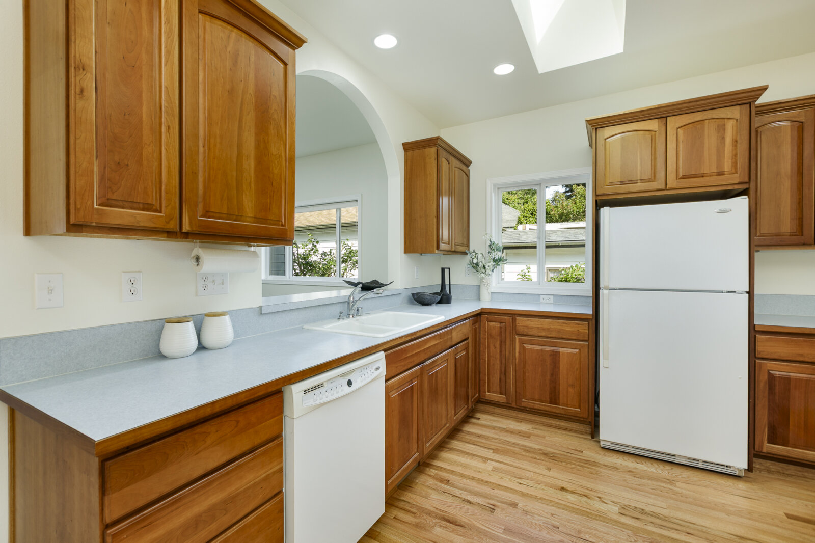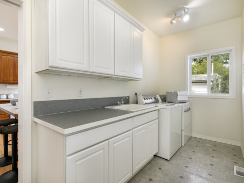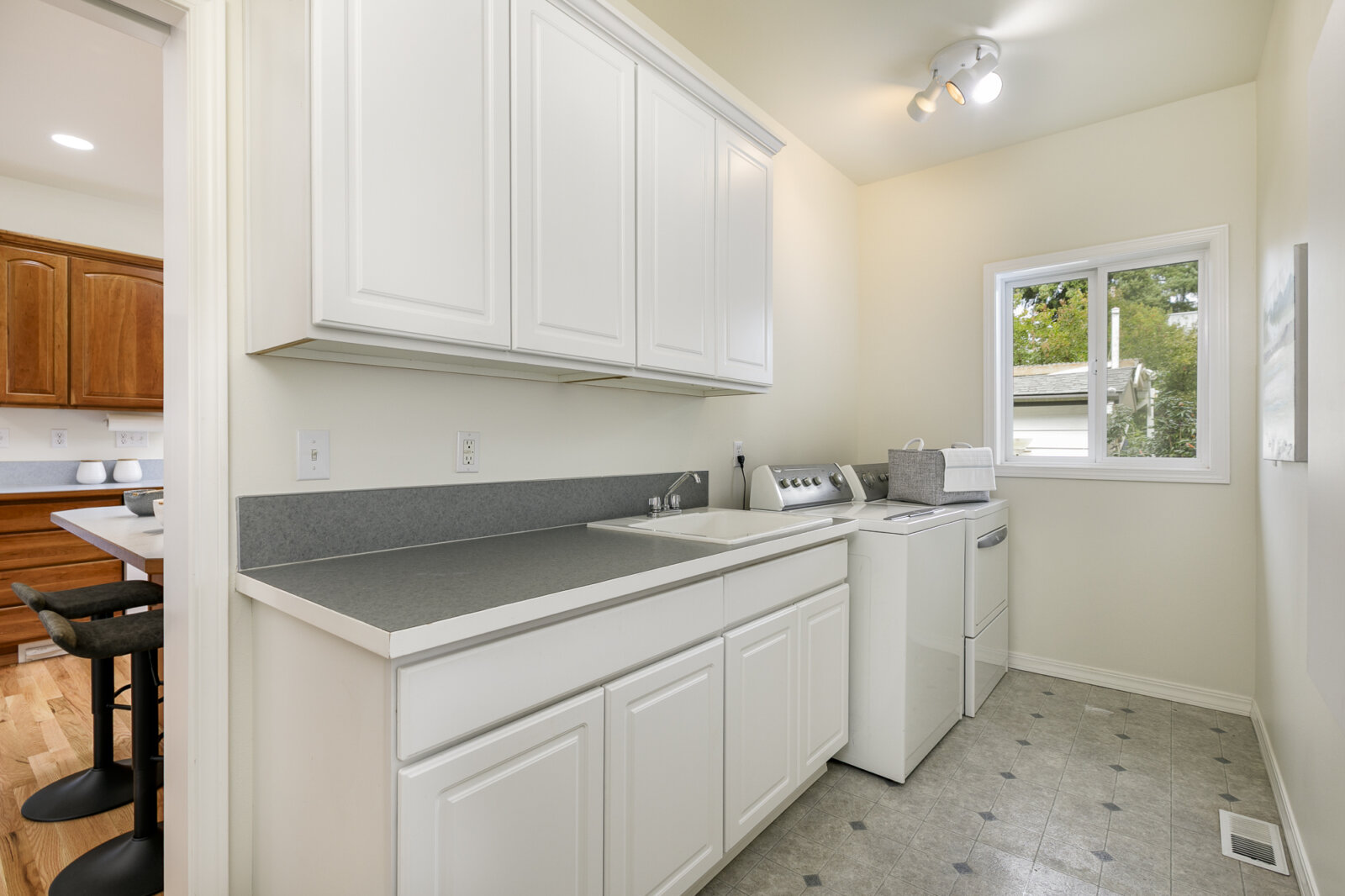 The kitchen is both functional and welcoming, featuring generous counter space, plentiful cabinetry, and a large eating nook ideal for casual dining or morning coffee. Conveniently located off the kitchen, the spacious laundry room includes extra storage and direct access to the oversized two-car garage, tucked off the alley for enhanced curb appeal. Beyond the kitchen, a small private back patio offers the perfect setting for barbecues, container gardens, or simply relaxing in the fresh air.