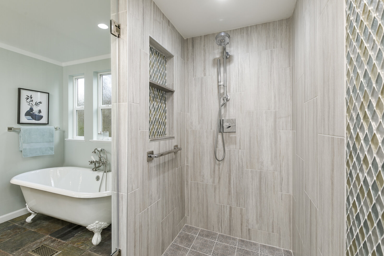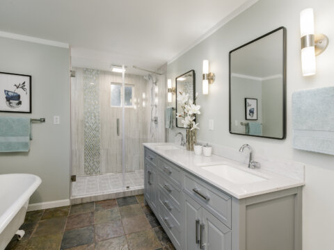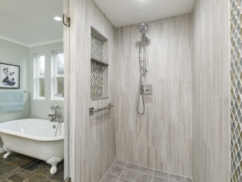 The main floor also features a spa-inspired primary suite complete with a walk-in shower, clawfoot tub, and dual vanities. A powder room and convenient laundry area add to the thoughtful layout.